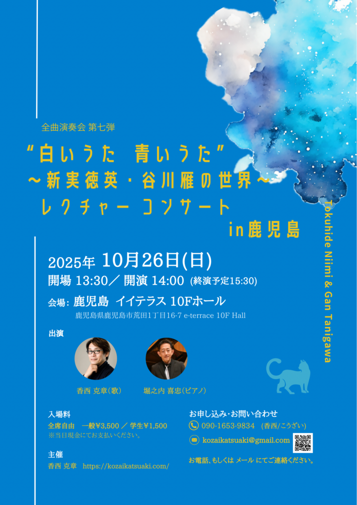 “白いうた 青いうた”レクチャーコンサート第七弾は、鹿児島県鹿児島市にて開催!お近くの方はぜひお運びください。