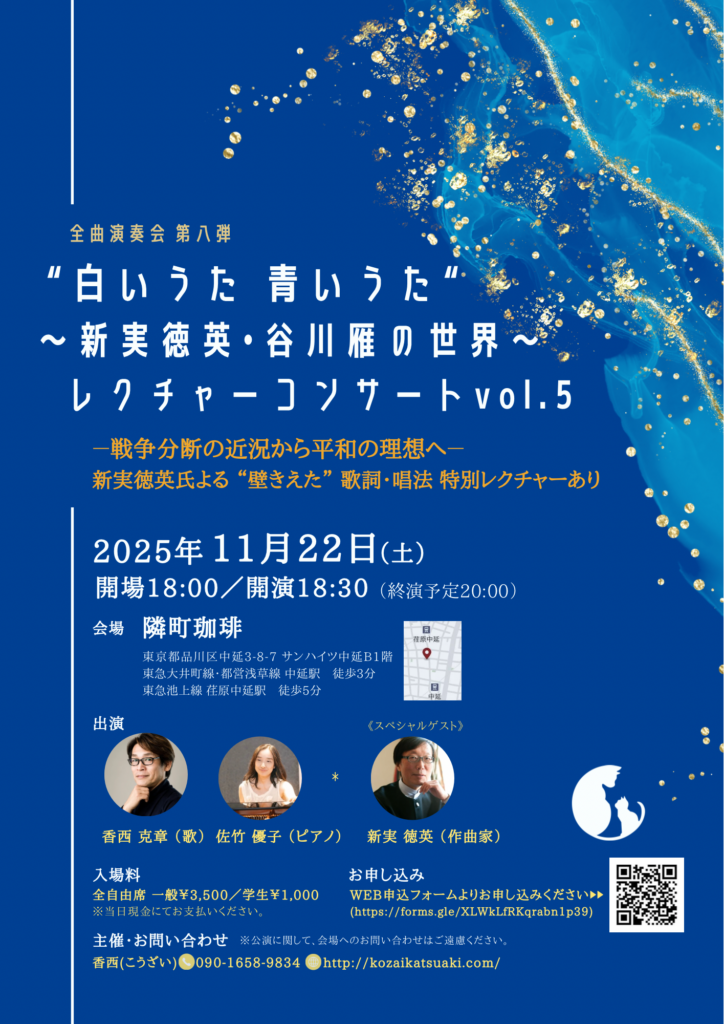 隣町珈琲での白青コンサート第5回!今回も作曲の新実徳英先生をスペシャルゲストに迎え、音と詩(詞)の世界に迫ります。今回は『戦争分断の近況から平和の理想へ』をテーマに、白青から”壁きえた”を取り上げ、新実先生の歌詞・唱法の特別レクチャーも予定しています。今回はどんな白青の世界がひろがるのでしょう。どうぞご参加お待ちしております!